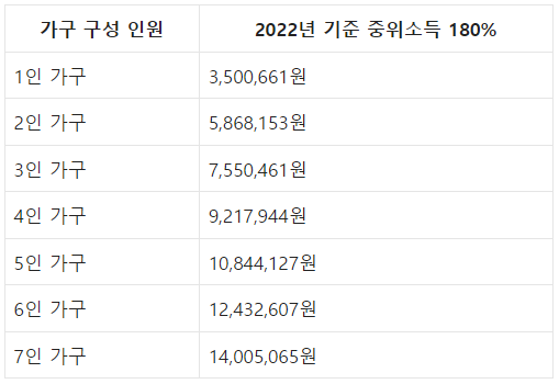 가구 소득은 본인 포함 가족 구성원의 소득의 합이 기준 중위소득의 180% 이하가 되어야 합니다. 2023년 7월 이후 가입자부터 2022년 기준 중위소득의 180% 이하를 기준으로 합니다.